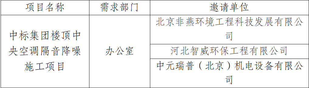 按照《中國標(biāo)準(zhǔn)科技集團(tuán)有限公司采購工作管理辦法(試行)》要求,現(xiàn)對中標(biāo)集團(tuán)樓頂中央空調(diào)隔音降噪施工項(xiàng)目競爭性談判邀請單位公示。